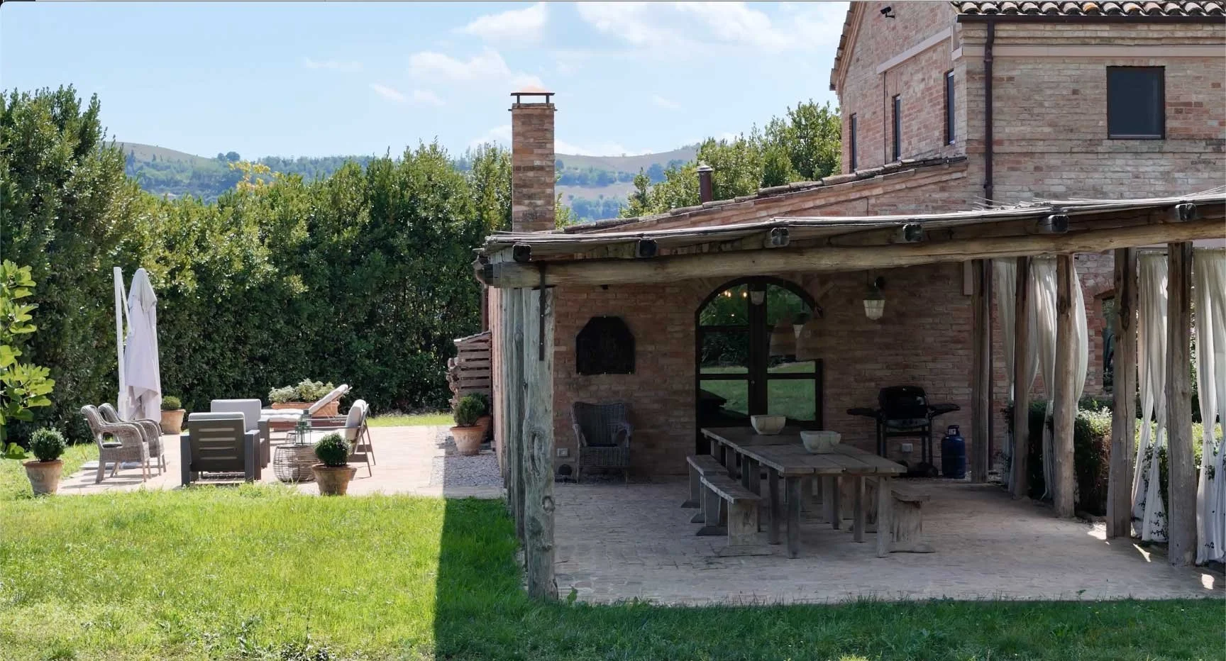 Just off the kitchen, two welcoming gathering areas await. The loggia features a wooden table with seating for up to 20 guests, perfect for al fresco dining. Just steps away, the patio offers several comfortable lounge areas, creating an ideal setting for morning coffee or relaxed evening conversations.